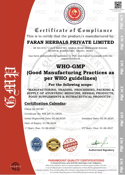 The WHO-GMP (World Health Organization Good Manufacturing Practices) Certificate ensures that products are consistently produced and controlled according to quality standards. It is designed to minimize risks involved in pharmaceutical production that cannot be eliminated through testing the final product. This certification is crucial for ensuring the safety, efficacy, and quality of medicines and is recognized internationally as a benchmark for pharmaceutical manufacturing practices.